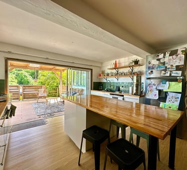 Grand espace de vie ouvert avec salon et cuisine tout équipée.